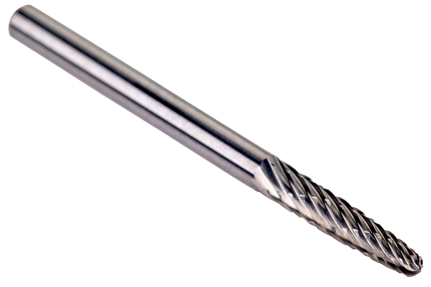 Rounded tree burr (F shape), diameter 3mm with 14mm length of cut, 38mm overall length and 3mm shank, solid carbide with bright finish, AS single cut flute style with light left-hand cross cut for multi-angle contouring, rounding of edges and cutting into hard to reach areas in high-temperature alloys