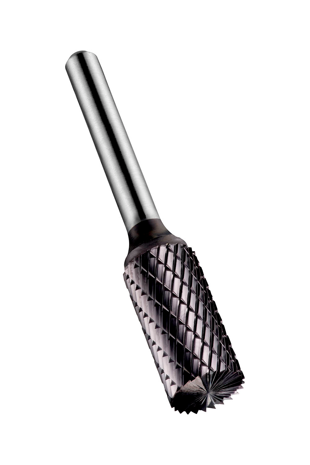 Cylinder burr with end cut (B shape), diameter 8mm with 19mm length of cut, 64mm overall length and 6mm shank, carbide tipped with toughened and hardened steel shank and TiAlN coating, DC double cut flute style with close spaced edges for machining surfaces and right-angled corners in steel and cast steel, stainless steel, cast-iron, copper or copper alloys, high-temperature alloys, hardened materials