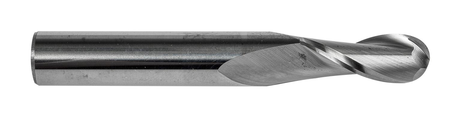 Regular length ball-nose end mill with 2 flutes, diameter 12mm with 25mm length of cut, 75mm overall length and 6mm full profile radius, according to DORMER standard with a 12mm plain shank, solid carbide with bright finish, 30° helix for copy milling in steel and cast steel, stainless steel, malleable, ductile and compacted graphite cast-iron and copper or copper alloys