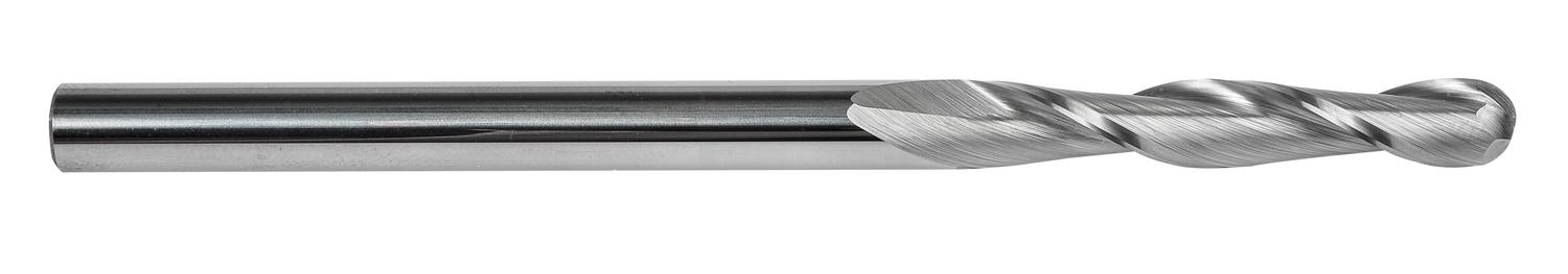 Extra long series ball-nose end mill with 2 flutes, diameter 1/8″ with 1″ length of cut, 3″ overall length and 1/16″ full profile radius, according to DORMER standard with a 1/8″ plain shank, solid carbide with bright finish, 30° helix for copy milling in steel and cast steel, stainless steel, malleable, ductile and compacted graphite cast-iron and copper or copper alloys
