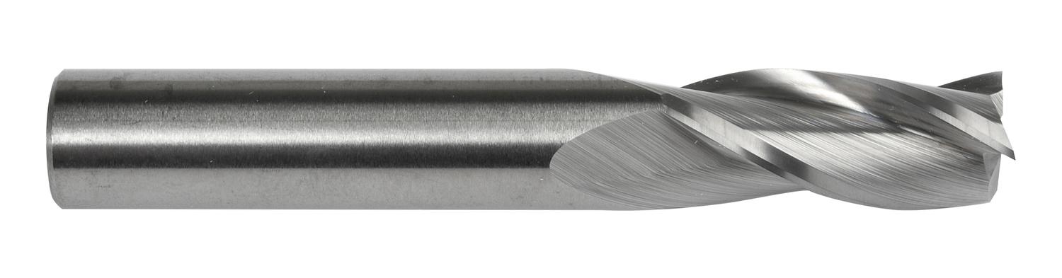 Regular length end mill with 3 flutes, diameter 3/8″ with 7/8″ length of cut and 2.1/2″ overall length, according to DORMER standard with a 3/8″ plain shank, solid carbide with bright finish, 30° helix for shoulder milling and slot milling in steel and cast steel, stainless steel, malleable, ductile and compacted graphite cast-iron and copper or copper alloys