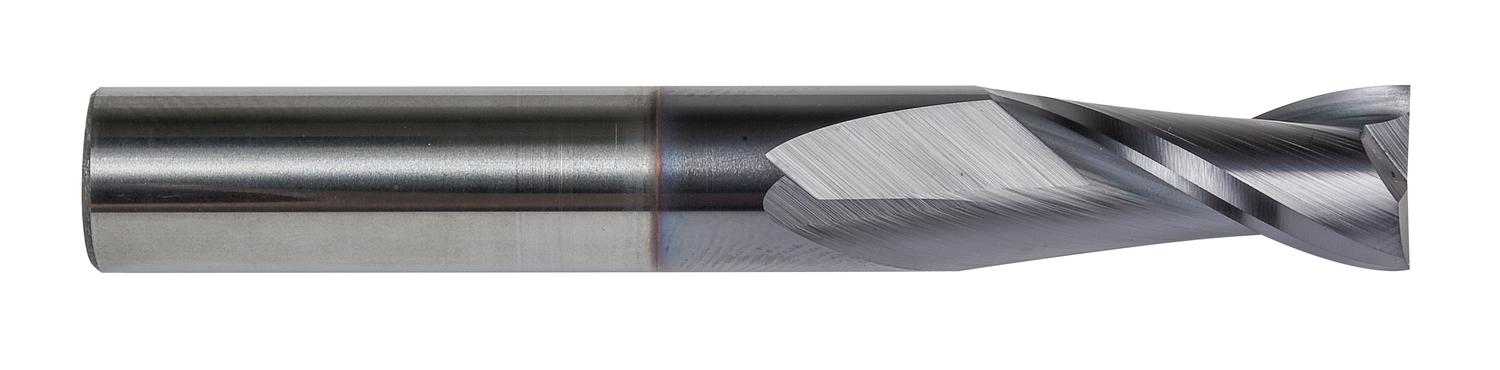 Extra long series end mill with 2 flutes, diameter 1/8″ with 1″ length of cut and 3″ overall length, according to DORMER standard with a 1/8″ plain shank, solid carbide with TiAlN coating, 30° helix for slot milling in steel and cast steel, ferritic, martensitic and austenitic stainless steel and cast-iron