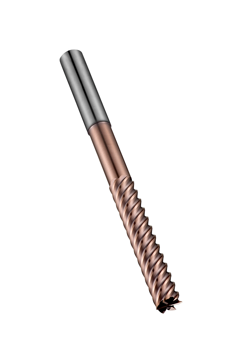 Extra long series finishing end mill with 6 flutes, diameter 8mm with 41mm length of cut, 100mm overall length and 60mm reach with neck relief, according to DORMER standard with a 8mm plain shank, solid carbide with TiSiN coating, 50° helix and -26° rake angle for shoulder milling in hardened materials