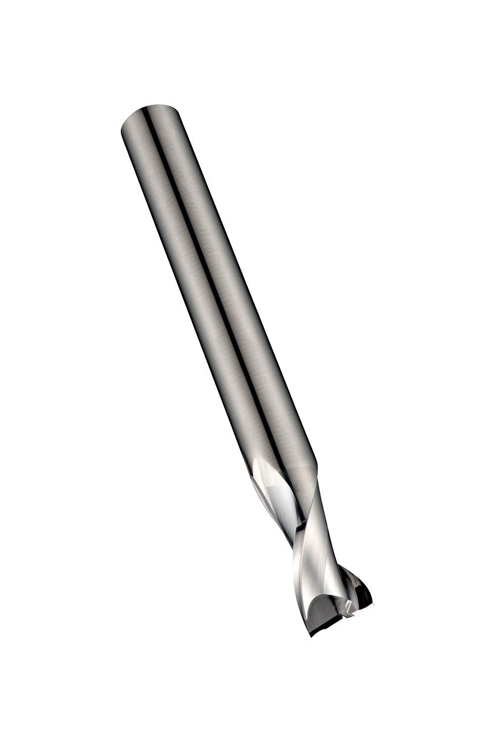 Extra short series end mill with 2 flutes, diameter 16.3mm with 20mm length of cut, 125mm overall length and 0.1mm corner radii, according to DORMER standard with a 16mm plain shank, solid carbide with polished finish, 30° helix and 20° rake angle for shoulder milling and slot milling in non-ferrous metals