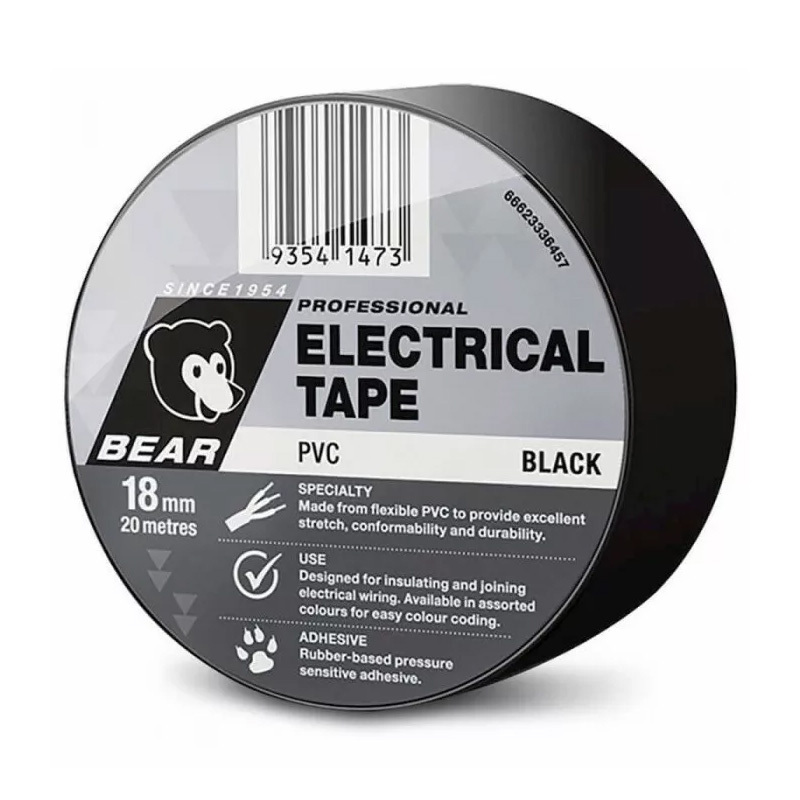 Home » Shop » CUTTING TOOLS (HSS & Carbide) » ABRASIVES » BEAR PVC ELECTRICAL TAPE » ELECTRICAL TAPE 504 18mm x 20M – BLACK BEAR PVC