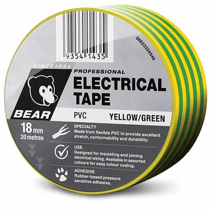 Home » Shop » CUTTING TOOLS (HSS & Carbide) » ABRASIVES » BEAR PVC ELECTRICAL TAPE » ELECTRICAL TAPE 504 18mm x 20M – YELL/GRN BEAR PVC