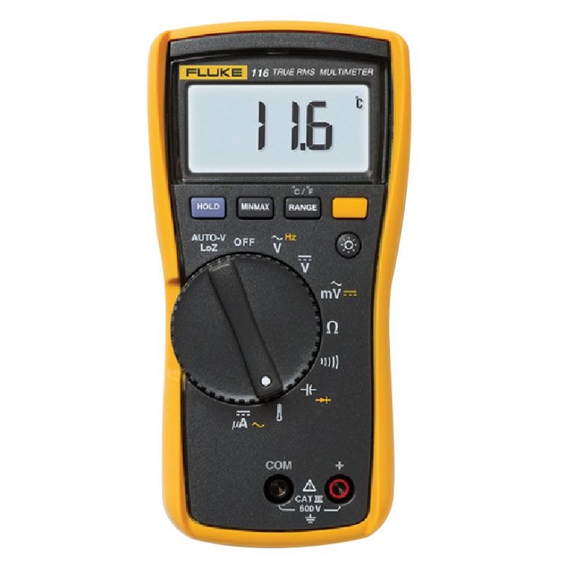 The Fluke 116 was specifically designed for HVAC professionals. It has everything you need to quickly troubleshoot problems with HVAC equipment and flame sensors, including a built-in thermometer to measure temperatures up to 400°C (752°F) and microamps to test flame sensors. The Fluke 116 also measures resistance, continuity, frequency, and capacitance. And the large white LED backlight makes it easy to see results even in poorly lit areas.