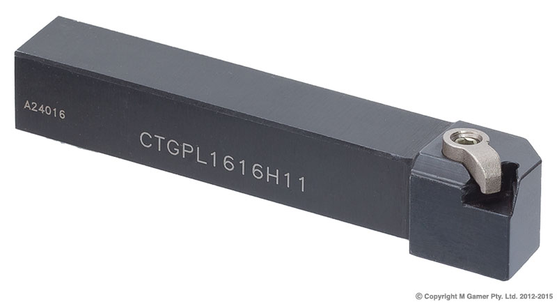 ISO Designation: CTGPL1616H11 Clamping System: Clamp Insert Seat: 60° Trianglar Insert: TPMR1103 Cutting Angle: 90° Cutting Direction: Left Handed Shank Height: 16 mm Shank Width: 16 mm Tool Holder Length: 100 mm