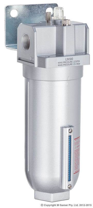 • Water level indicator for easy monitoring Port Size: 3/4″ NPT Max Input Press.: 250 psi Max Flow: 162.4 cfm Operating Temp. Range: 5-60 °C Oil Capacity: 300 mL