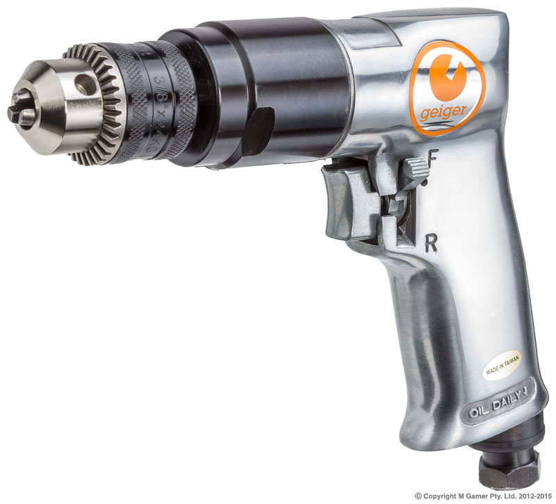 • Pistol grip reversible drill with 3/8″ chuck • Forward and reverse lever beside the trigger • Exhausts through the base of the handle Free Speed : 1,800rpm Chuck Size : 3/8″ (10mm) Drilling Capacity : 10mm (3/8″) Spindle Size : 3/8 x 24 UNF Weight : 1.36kg Inlet: 1/4″ Length: 165(L) x 155(H) x 38(W)mm Air consumption: 10cfm Recommended air pressure: 90psi Includes chuck key.