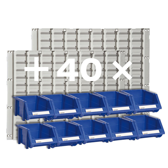 • Wall mountable kit includes 2 HB Series panels, 40 HB210B Blue bins, screws & wall plugs. • Acid and oil resistant. Panel size: 605W mm x 455H mm x 8D mm Bin size: 105W mm x 137D mm x 76H mm