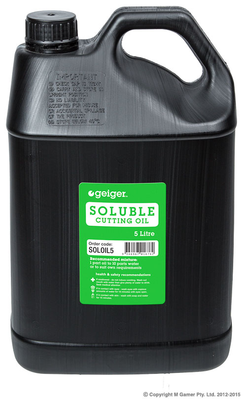 • Geiger Soluble Cutting Oil is blended specifically for industrial engineering applications, containing sulphur based extreme pressure additives. Specifically formulated emulsifiers and bactericides provide excellent stability and rust prevention characteristics in hard water up to 400 ppm (expressed as calcium carbonate). Mix at between 5% to 10% concentration with clean tap water to form a white emulsion. Quality: 5 Litre Mixing Ratio: 10:1