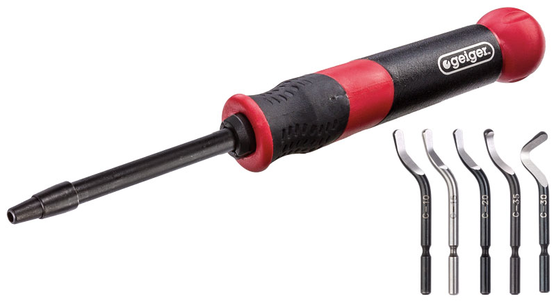 • Collet accepts all telescopic shafts, double edged deburrers and scrapers • Acytal body handle with Comfort grip zone • Steel telescopic shaft • Steel quick-release ring (not plastic) • Black powder coated aluminium handle inlay for extra durability Multi-Component Handle (GDSTSDMK) & blade holder Includes Standard Deburring blades: GDSC10, GDSC15, GDSC20, GDSC30, GDSC35