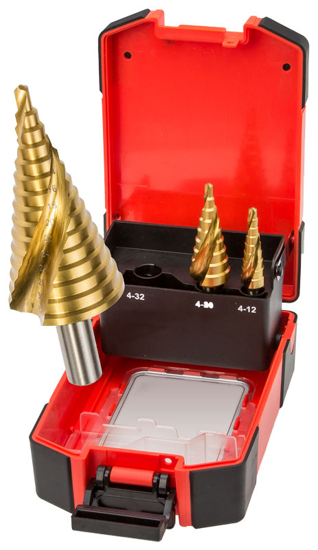 • Versatile step drill set • TiN coated for extended tool life • Robust display case with locking latch • Helical flute produces soft cutting action Cutters: 3pce Step Drill 1: 4-12mm Step Drill 2: 4-20mm Step Drill 3: 4-32mm Material: HSS Coating: Titanium Nitride (TiN)
