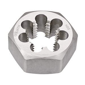 Goliath solid High Speed Steel (HSS) Die Nuts are used for cutting of new male threads as well as extending / cleaning / resizing of existing threads where a button die is not suited due to work space restrictions and / or on site thread accessibility.