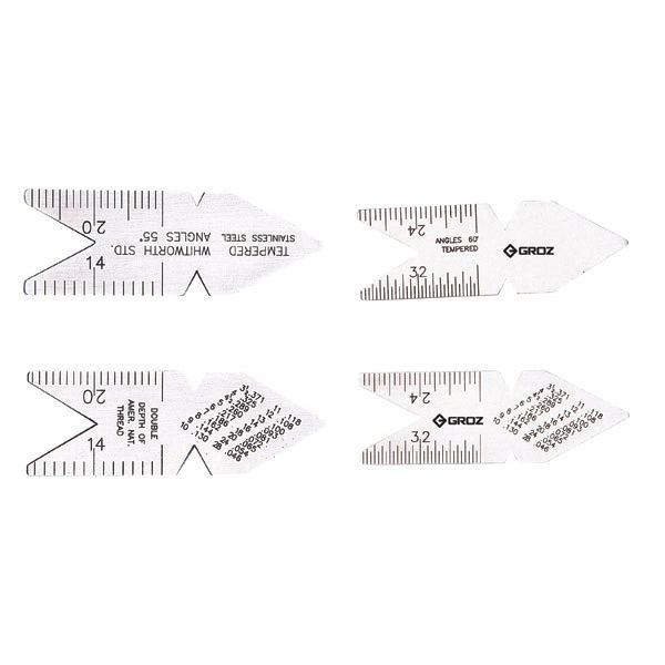 Manufactured from stainless steel, these small flat gauges have angles of 55° and 60°. Very useful for grinding and setting thread cutting tools, these may also be used for checking the pitch of threads through the permanently deep etched graduations in 14ths, 20ths, 24ths and 32nds of an inch. These gauges meet the American National or US 60° and Whitworth or English 55° specifications.