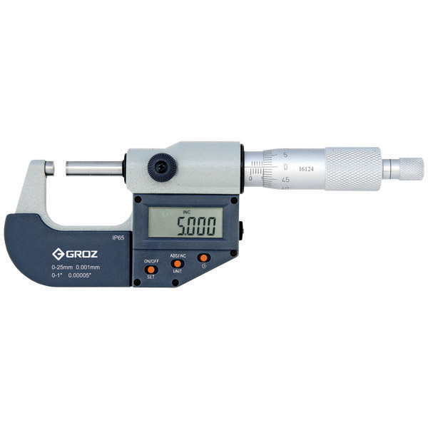IP65 rated enclosure – Totally protected against dust ingress and protection against splash water. Ratchet thimble. Chrome plated frame with heat shield. Metric and imperial digital readout on LCD screen. Carbide anvil for added durability with 0.6 micron (0.000024″) flatness. Resolution : 0.001 mm (0.00005″). Supplied in moulded plastic case