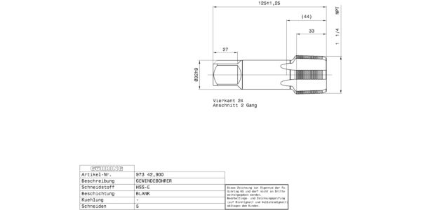 Machine taps for NPT-threads 1 1/4 / 1.5xD / Company std. / HSS-E / bright / Type: N / Form: C / blind hole / Cutting direction: right-hand /