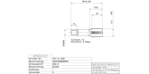 Machine taps for NPT-threads 1/2 / 1.5xD / Company std. / HSS-E / bright / Type: N / Form: C / blind hole / Cutting direction: right-hand /