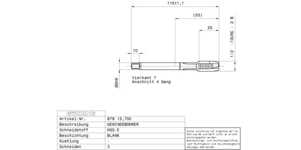 Machine taps for UNC-threads 1/2 – 13 / 2B / 3xD / ~DIN 376 / DIN 2184-1 / HSS-E / bright / Type: N / Form: B / through hole / Cutting direction: right-hand /