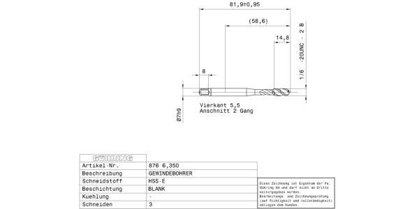 Machine taps for UNC-threads 1/4 – 20 / 2B / 3xD / ~DIN 371 / DIN 2184-1 / HSS-E / bright / Type: N R40 / Form: C / blind hole / Cutting direction: right-hand /