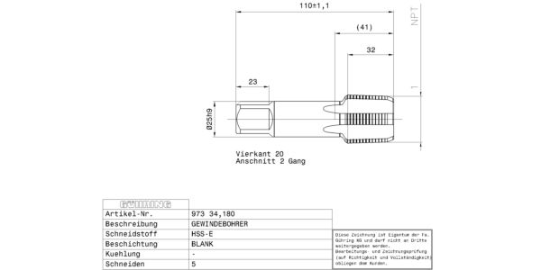 Machine taps for NPT-threads 1 / 1.5xD / Company std. / HSS-E / bright / Type: N / Form: C / blind hole / Cutting direction: right-hand /