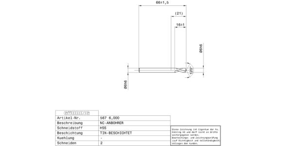 NC spotting drills 120° HSS / Ø 6.000 mm h6 / DIN 1835-A / Company std. / Surface: TiN / Type: N / Cutting direction: right-hand / relieved cone 120°