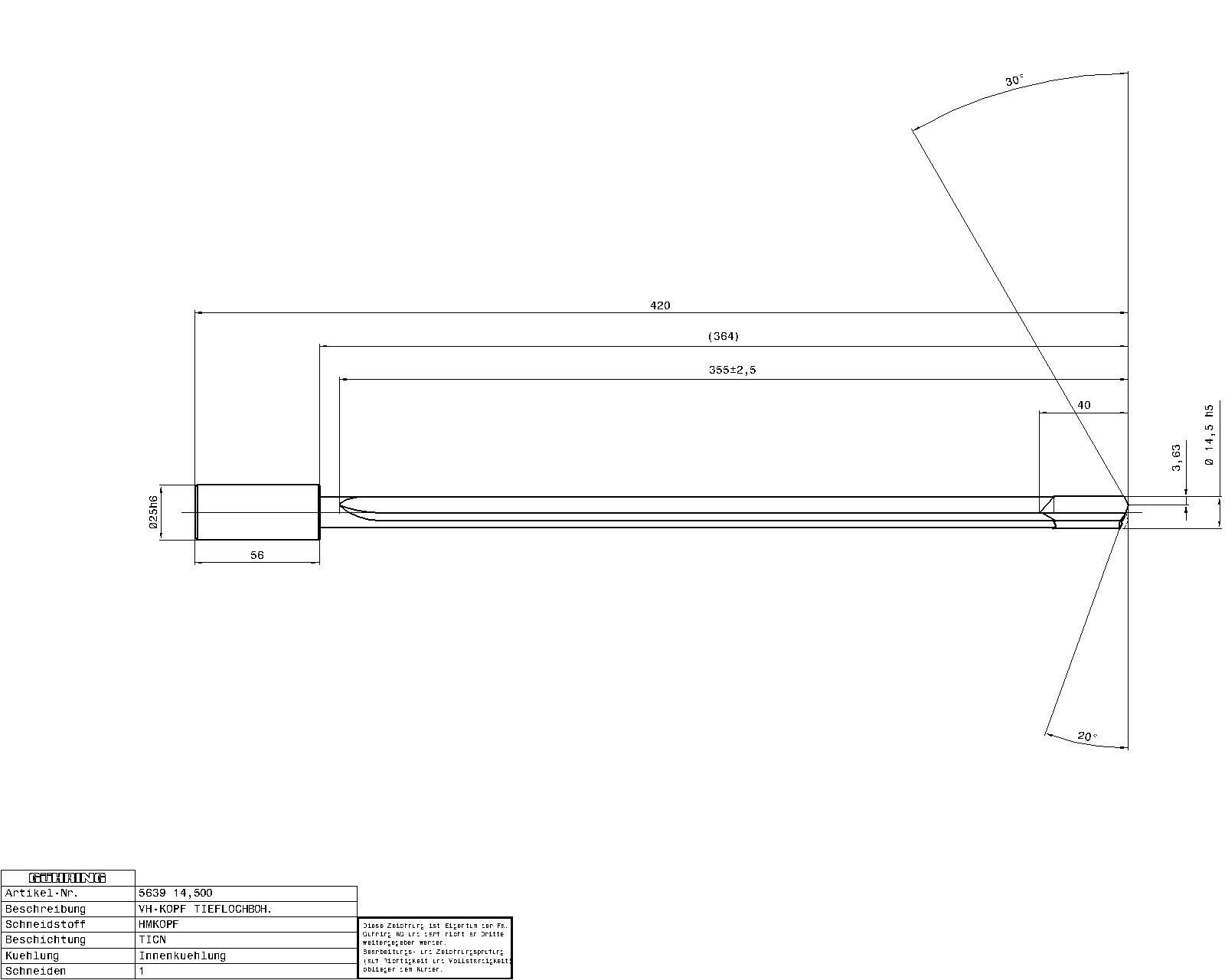 Single-fluted gun drills EB 80 / Ø 14.500 mm / 20xD / Company std. / Carbide / TiCN / Type: EB 80 / Cutting direction: right-hand /