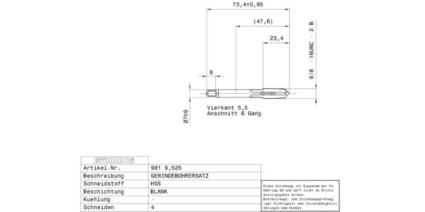 Set Hand taps for UNC-threads 3/8 – 16 / 2B / ~DIN 352 / DIN 2184-2 / HSS / bright / Type: N / through-, blind hole / Cutting direction: right-hand /