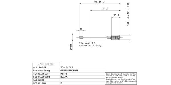 Machine taps for UNF-threads 3/8 – 24 / 2B / 3xD / ~DIN 374 / DIN 2184-1 / HSS-E / bright / Type: N / Form: B / through hole / Cutting direction: right-hand /