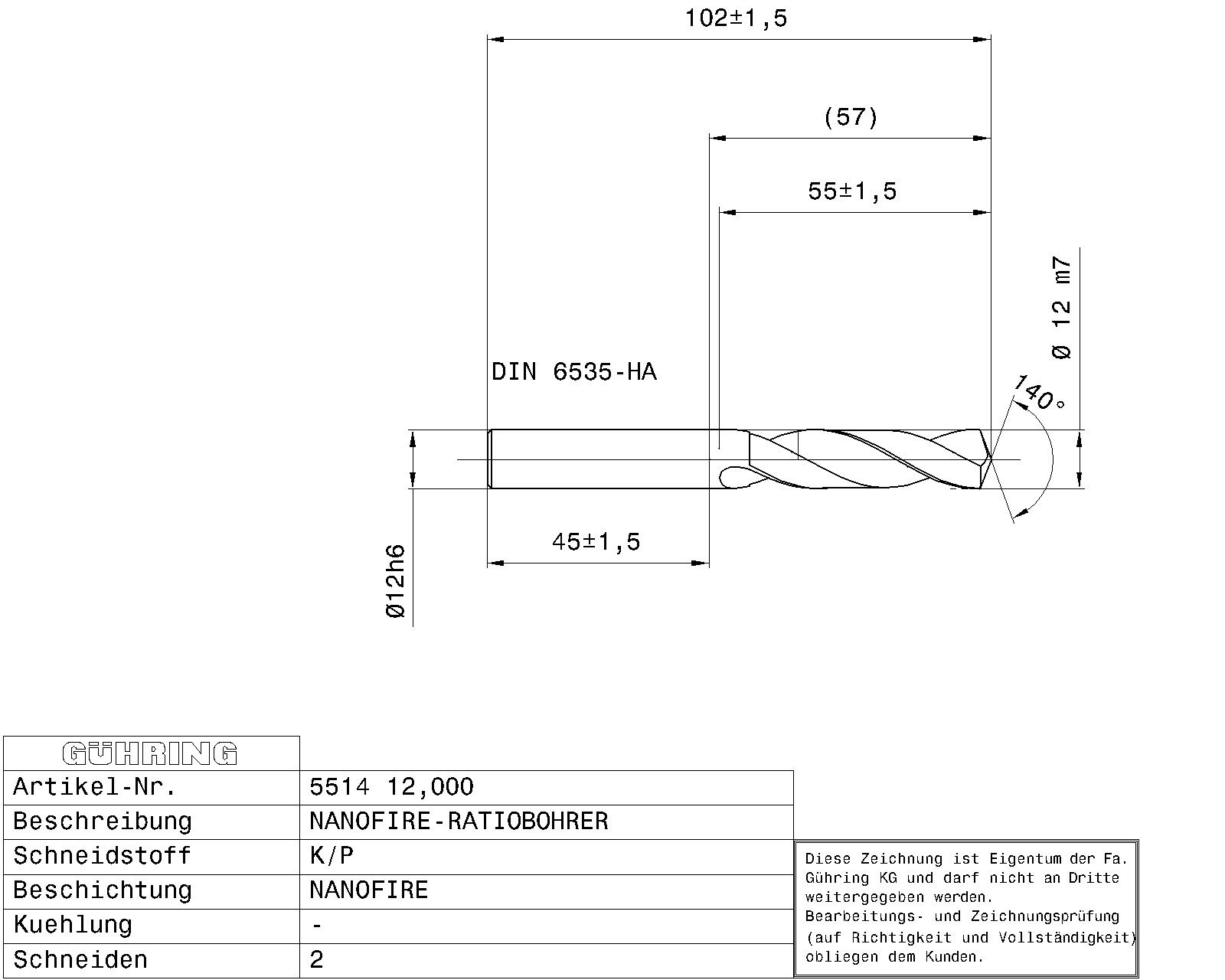 Ratio drills without coolant ducts Solid carbide / Ø 12.000 mm m7 / 3xD / DIN 6537K / Surface: nanoFIRE / Cutting direction: right-hand / facet point grinding 140°