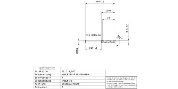 Ratio drills with coolant ducts Solid carbide / Ø 5.000 mm m7 / 3xD / DIN 6537K / Surface: nanoFIRE / Cutting direction: right-hand / facet point grinding 140°