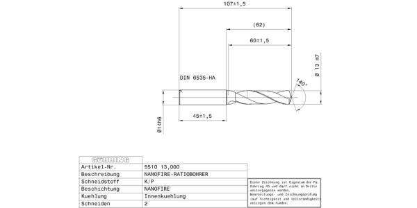 Ratio drills with coolant ducts Solid carbide / Ø 13.000 mm m7 / 3xD / DIN 6537K / Surface: nanoFIRE / Cutting direction: right-hand / facet point grinding 140°