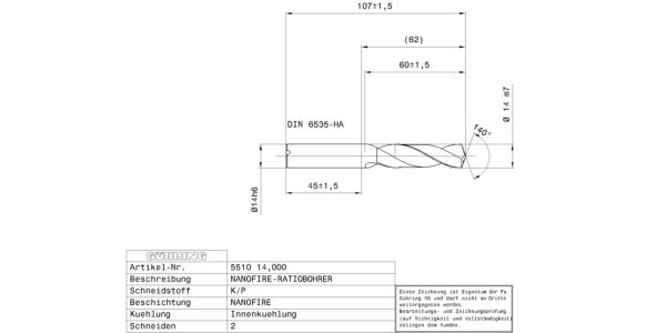 Ratio drills with coolant ducts Solid carbide / Ø 14.000 mm m7 / 3xD / DIN 6537K / Surface: nanoFIRE / Cutting direction: right-hand / facet point grinding 140°
