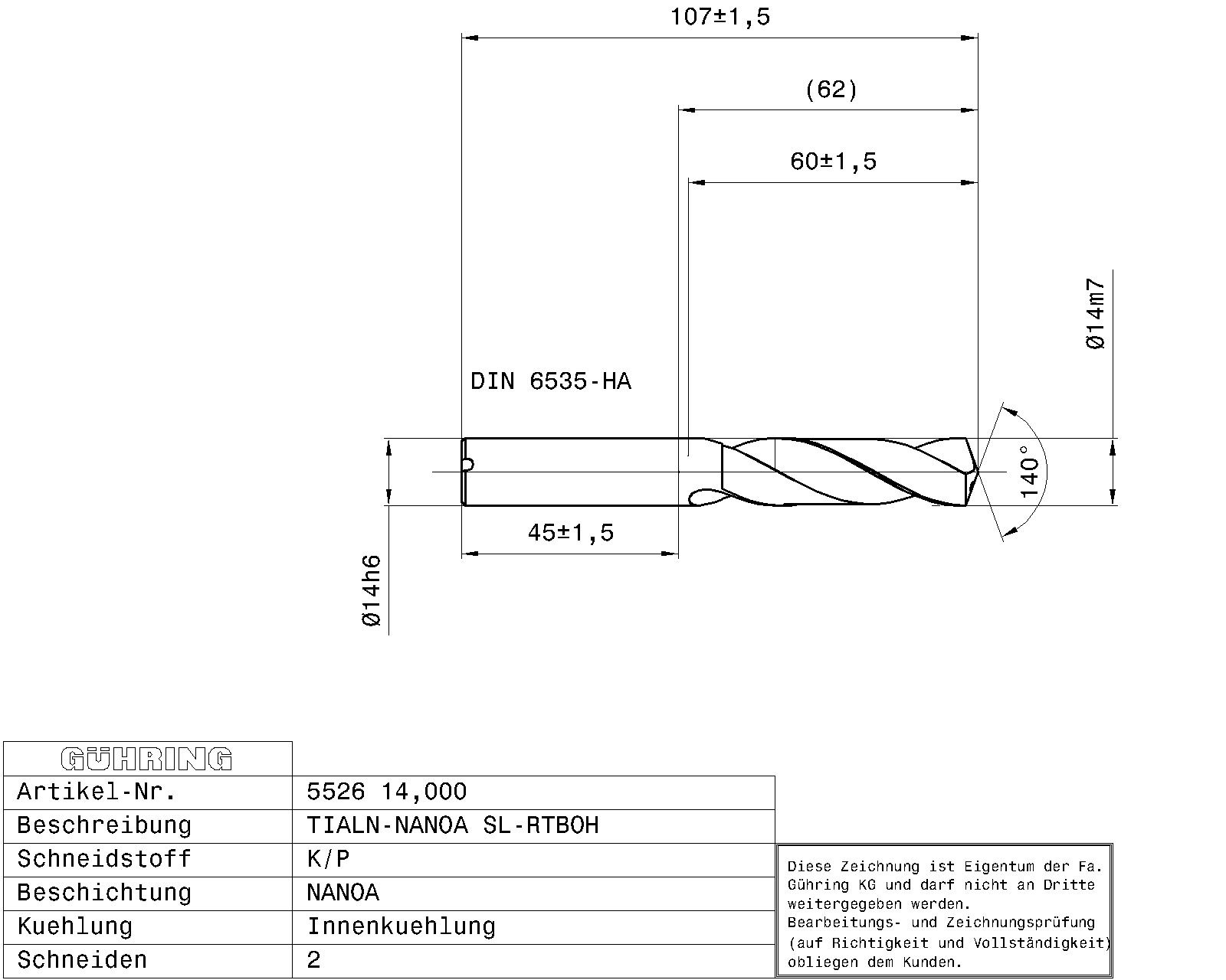 Ratio drills with coolant ducts Solid carbide / Ø 14.000 mm m7 / 3xD / DIN 6537K / Surface: TiAlN-nanoA / Cutting direction: right-hand / facet point grinding 140°