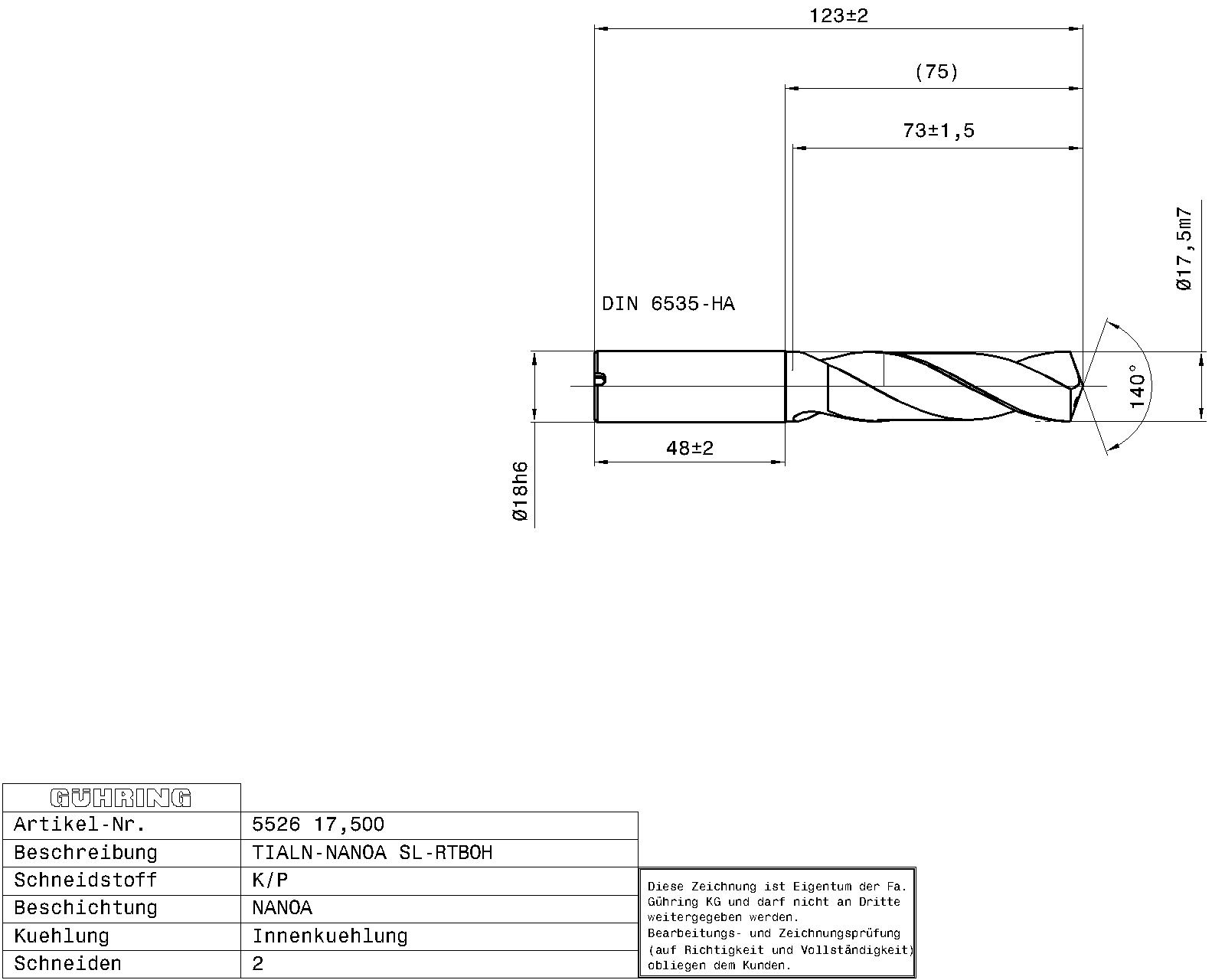 Ratio drills with coolant ducts Solid carbide / Ø 17.500 mm m7 / 3xD / DIN 6537K / Surface: TiAlN-nanoA / Cutting direction: right-hand / facet point grinding 140°