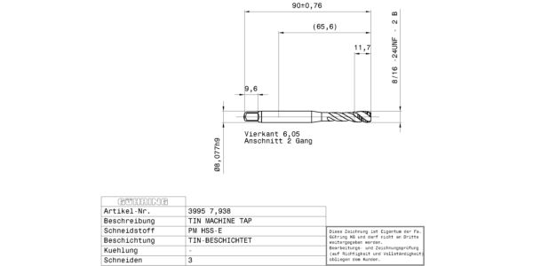 Machine taps for UNF-threads 5/16 – 24 / 2B / Company std. / DIN/ANSI / HSS-E-PM / TiN / Type: H R40 / Form: C / blind hole / Cutting direction: right-hand