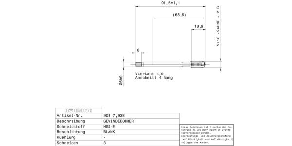 Machine taps for UNF-threads 5/16 – 24 / 2B / 3xD / ~DIN 374 / DIN 2184-1 / HSS-E / bright / Type: N / Form: B / through hole / Cutting direction: right-hand /
