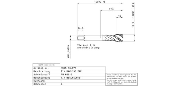 Machine taps for UNF-threads 5/8 – 18 / 2B / Company std. / DIN/ANSI / HSS-E-PM / TiN / Type: H R40 / Form: C / blind hole / Cutting direction: right-hand