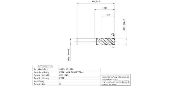 Slot drills GH 100 U (3-fluted) / Ø 15.875 mm / h10 / Company std. / Solid carbide / FIRE / Type: NH / Cutting direction: right-hand