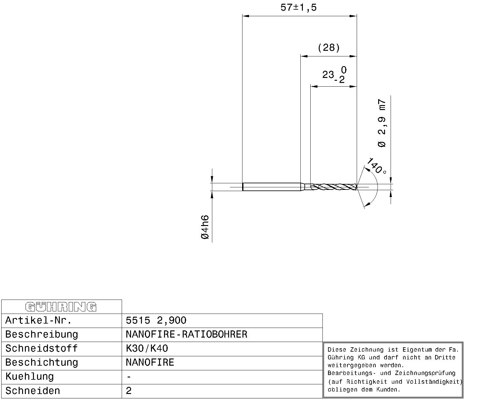 Ratio drills without coolant ducts Solid carbide / Ø 2.900 mm m7 / 5xD / DIN 6537L / Surface: nanoFIRE / Cutting direction: right-hand / facet point grinding 140°
