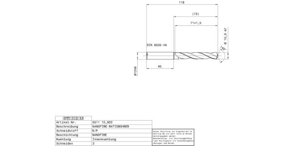 Ratio drills with coolant ducts Solid carbide / Ø 10.900 mm m7 / 5xD / DIN 6537L / Surface: nanoFIRE / Cutting direction: right-hand / facet point grinding 140°