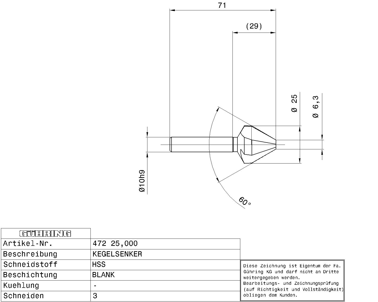 Countersinks 60° / Ø 25.000 mm / DIN 334 / HSS / bright / Form: C / Cutting direction: right-hand /