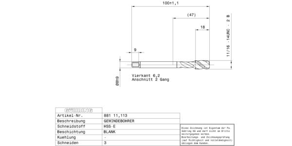 Machine taps for UNC-threads 7/16 – 14 / 2B / 3xD / ~DIN 376 / DIN 2184-1 / HSS-E / bright / Type: N R40 / Form: C / blind hole / Cutting direction: right-hand /