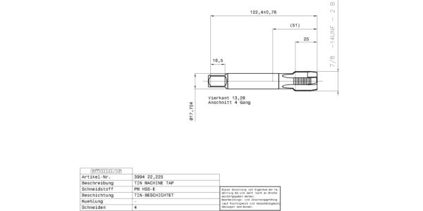 Machine taps for UNF-threads 7/8 – 14 / 2B / Company std. / DIN/ANSI / HSS-E-PM / TiN / Type: H / Form: B / through hole / Cutting direction: right-hand