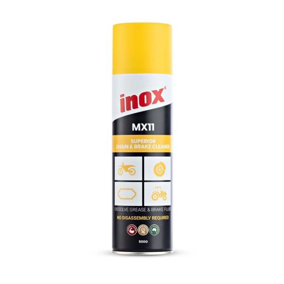 INOX MX11 Chain & Brake Clean readily dissolves oil, grease and grime and can be used as a degreaser for car, motorbike, truck, boat, industrial, mining, farming equipment parts, gears, cables, engines or on any equipment where there is contamination from any oil, grease or oil/grease dirt mixtures.