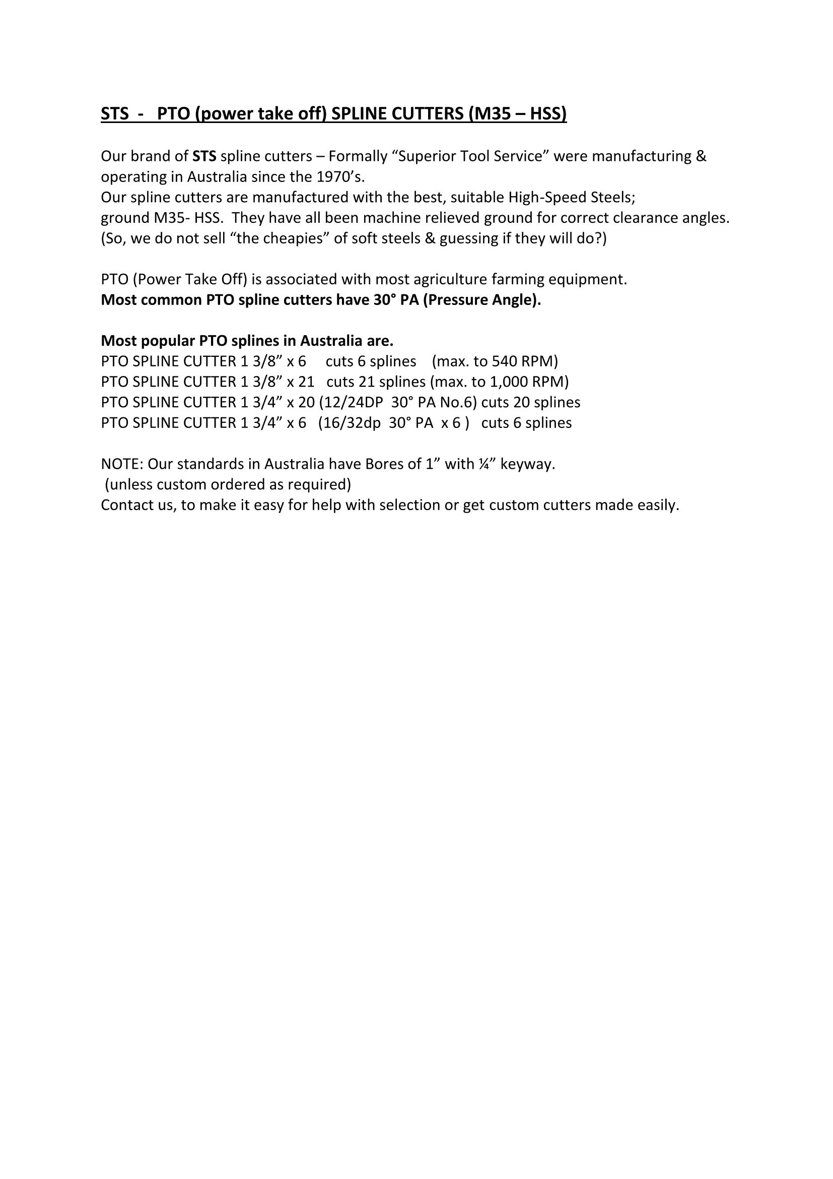 STS – PTO (power take off) SPLINE CUTTERS (M35 – HSS) Our brand of STS spline cutters – Formally “Superior Tool Service” were manufacturing & operating in Australia since the 1970’s. Our spline cutters are manufactured with the best, suitable High-Speed Steels; ground M35- HSS. They have all been machine relieved ground for correct clearance angles. (So, we do not sell “the cheapies” of soft steels & guessing if they will do?) PTO (Power Take Off) is associated with most agriculture farming equipment. Most common PTO spline cutters have 30° PA (Pressure Angle). Most popular PTO splines in Australia are. PTO SPLINE CUTTER 1 3/8” x 6 cuts 6 splines (max. to 540 RPM) PTO SPLINE CUTTER 1 3/8” x 21 cuts 21 splines (max. to 1,000 RPM) PTO SPLINE CUTTER 1 3/4” x 20 (12/24DP 30° PA No.6) cuts 20 splines PTO SPLINE CUTTER 1 3/4” x 6 (16/32dp 30° PA x 6 ) cuts 6 splines NOTE: Our standards in Australia have Bores of 1” with ¼” keyway. (unless custom ordered as required) Contact us, to make it easy for help with selection or get custom cutters made easily