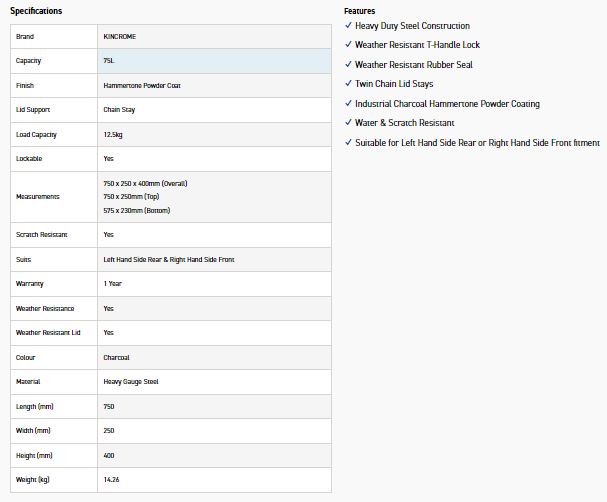 KINCROME 51028 UNDER UTE BOX STEEL LH750MM