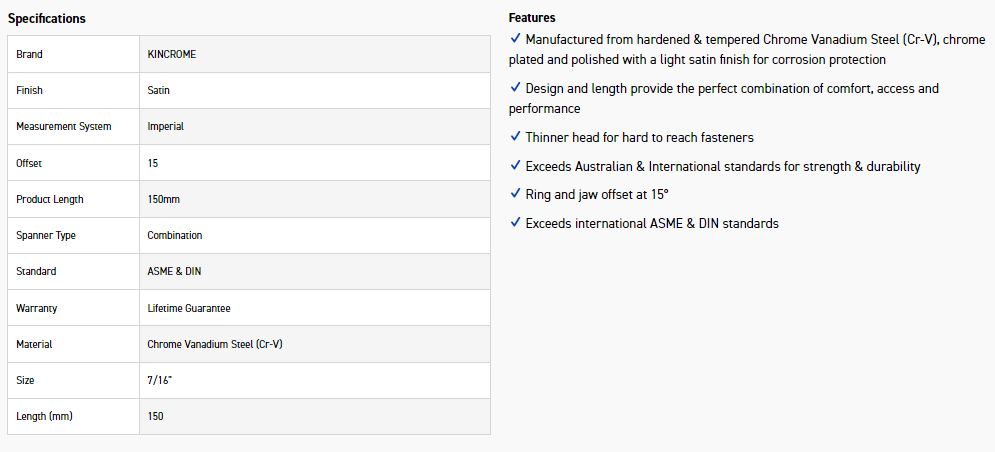 Kincrome’s range of European style spanners have undergone exhaustive independent testing and are 80% and 130% stronger than the ASME and DIN standards respectively. They feature a thinner head allowing the spanner to reach tighter areas and a rounder shaft for a more comfortable grip, especially when under heavy load. Although they are lighter, being manufactured from premium quality Chrome Vanadium Steel (Cr-V) means that they are extremely strong and durable. The shorter length decreases radial movement by up to 20% making access easier in hard to reach places and the satin finish provides great corrosion resistance