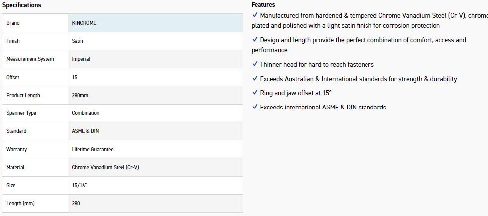 KINCROME C30C 15/16 COMBO SPANNER (SATIN)